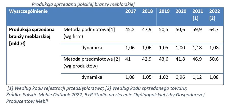Według raportu „Polskie Meble Outlook 2022”, polska branża meblarska zakończyła ubiegły rok z rekordowym wynikiem sprzedaży, który wzrósł z 50,6 mld zł w 2020 r. do 59,9 mld zł w 2021 roku, co oznacza skok o 18 proc. Wartość wyprodukowanych w 2021 roku mebli szacuje się na 46,9 mld zł co oznacza wzrost o 12 proc. w porównaniu do 2020 roku. W 2022 roku prognozuje się wzrost wartości produkcji sprzedanej do poziomu 64,7 mld zł i wzrost wartości wyprodukowanych mebli do wartości 50,6 mld zł (+8 proc).