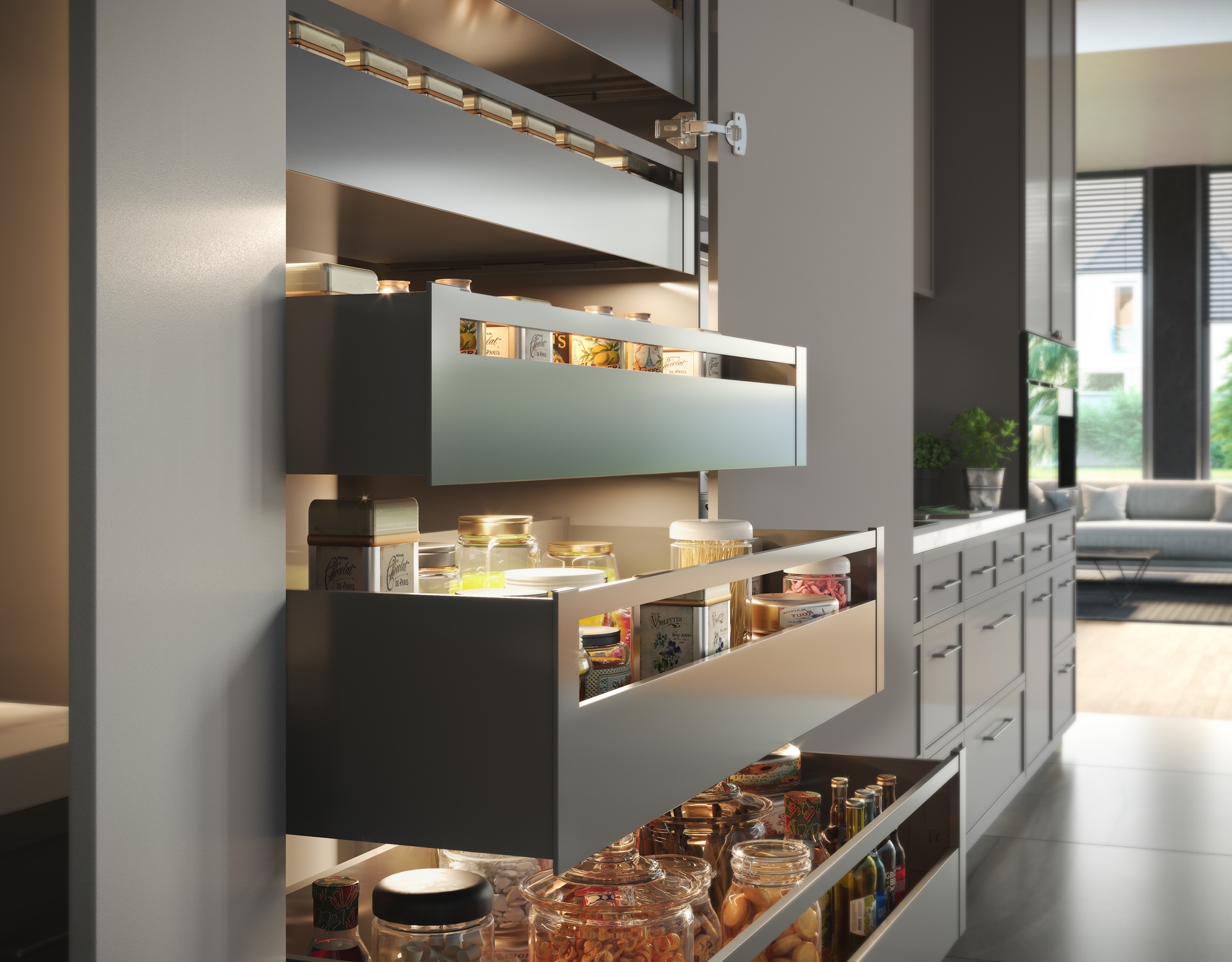 System Axis Pro daje wiele możliwości aranżacji i sprawdzi się nawet w wąskich miejscach, które sprytnie można zabudować. Cienki bok szuflady ma zaledwie 14 mm i doskonale wpasuje się w małe przestrzenie, bez straty miejsca wewnątrz szuflady. Dzięki mechanizmowi pełnego wysuwu zyskujemy swobodny dostęp do całej zawartości szuflady, bez uciążliwego sięgania po głębiej schowane akcesoria.