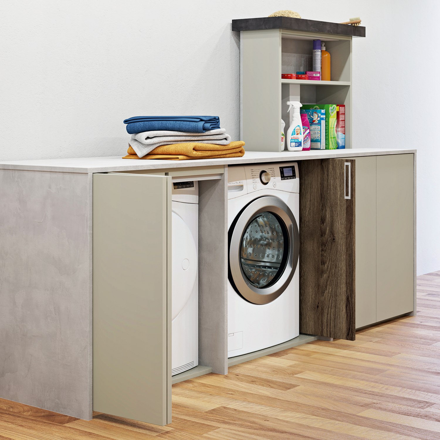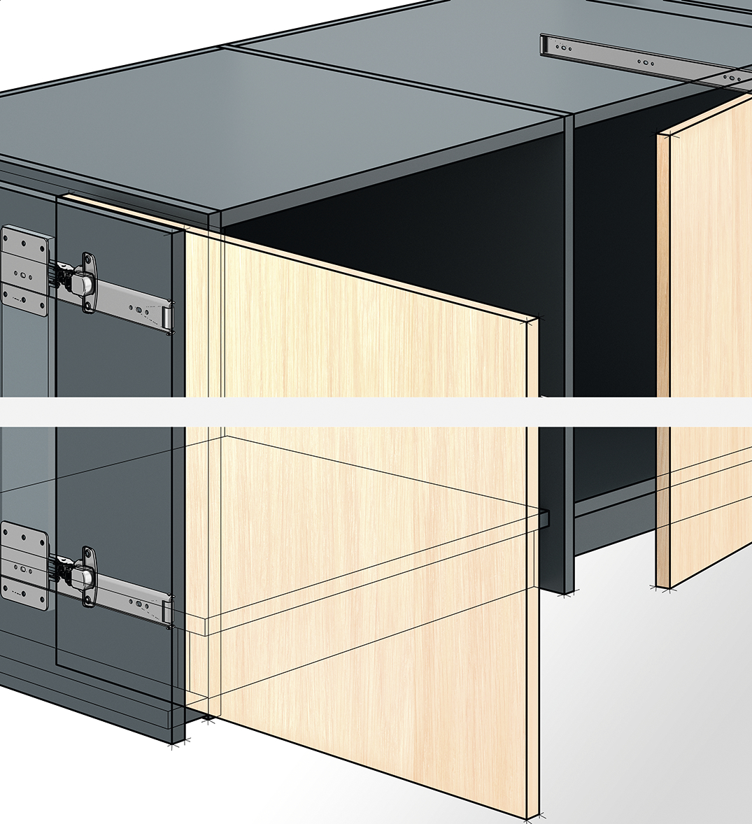W systemie KA 5740 fronty można po otwarciu wsunąć do wnętrza w korpusie. To doskonałe, innowacyjne rozwiązanie do szafek na sprzęt RTV albo domowych barków, a także zabudowy meblowej w pomieszczeniach gospodarczych. Jest przeznaczony do frontów od 300 do 700mm szerokości. Wszystkie warianty są wyposażonew blokadę wysunięcia.
