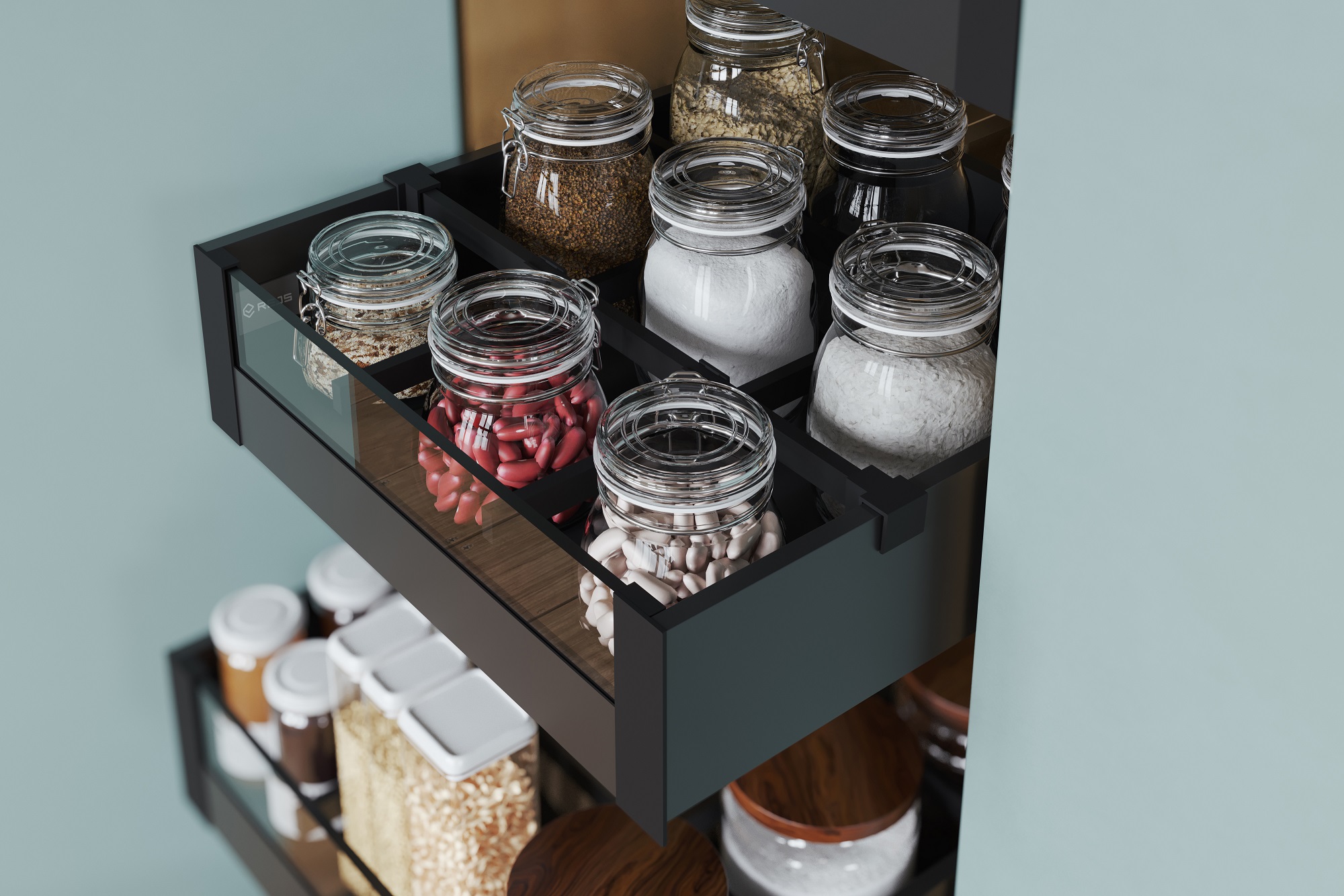 Inną wartą uwagi opcją są przeszklone boczki i fronty, które przydadzą się np. w garderobie. Dzięki wstawce z antracytowego szkła łatwiej zorientujemy się gdzie leży poszukiwana para skarpetek albo ulubiony krawat. Szuflady z przeszklonym frontem dostępne są w 4 wysokościach – 89, 121, 185, 249 mm, a z frontem i bokiem – w wys. 185 mm.