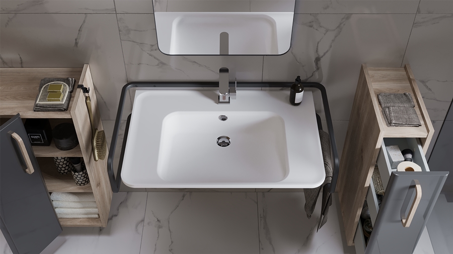 Planując umywalkę w łazience dla osób z niepełnosprawnością zadbano nie tylko o jej odpowiednią wysokość, ale również odpowiednie wyprofilowanie. Zastosowany przy umywalce wygodny reling ułatwia poruszanie się, nie wpływając na komfort użytkowania innych domowników. Płaski przód umywalki ułatwia postawienie na niej kosmetyków czy przyborów do pielęgnacji. Po obu stronach umywalki zastosowano dwa wygodne blaty, które zostały uwzględnione w projekcie po sugestii starszych osób. W tym innowacyjnym projekcie łazienki przewidziano aż 3 sposoby montażu umywalki – w wersji wiszącej, wiszącej z szafką oraz stojącej na specjalnym, montowanym do relingu blacie.