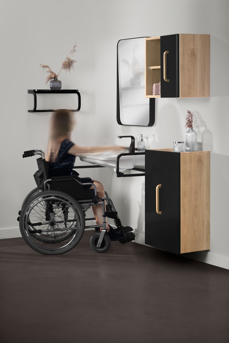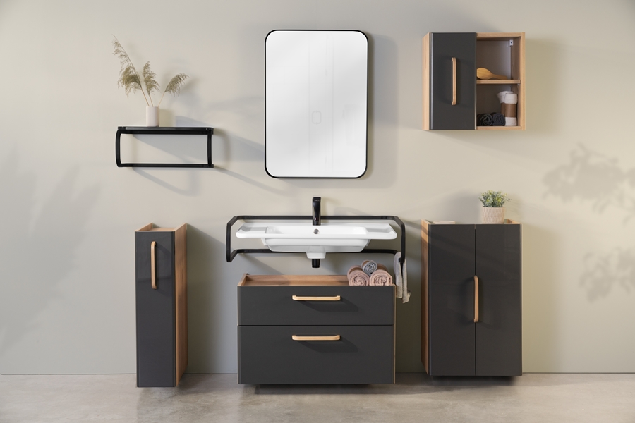 Kolorystyka kolekcji COMFY nie jest przypadkowa. Jak wynika z konsultacji społecznych, które były podstawą tego projektu, osoby niedowidzące najlepiej odbierają mocne kontrasty kolorystyczne we wnętrzu. To ułatwia im poruszanie się po przestrzeni łazienki i pozwala im określić odległości pomiędzy poszczególnymi urządzeniami. Biel i czerń zastosowane w projekcie są ze sobą subtelnie skomponowane: białe fronty szafek doskonale współgrają z czarnymi bokami i uchwytami. W drugiej wersji połączono barwę dębu ze szlachetną czernią.