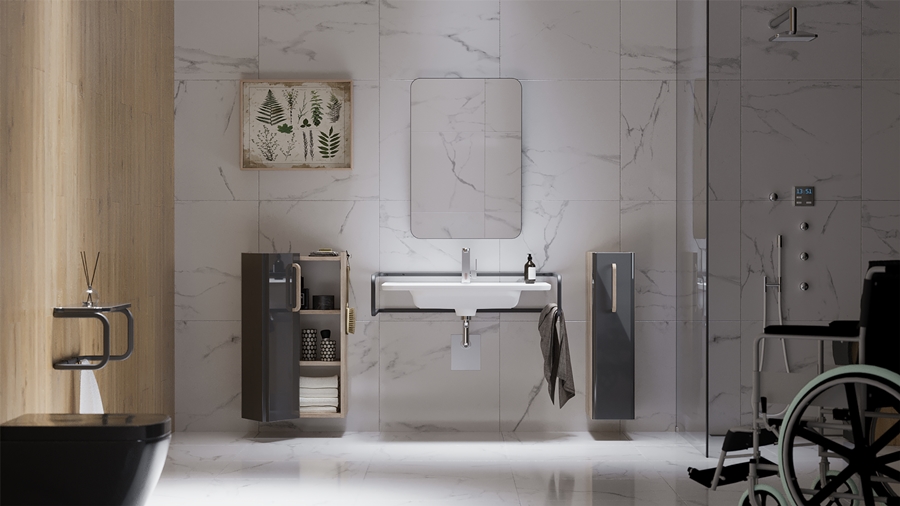 Aranżując łazienkę z wykorzystaniem mebli z kolekcji COMFY zadbano o to, aby senior lub osoba z ograniczeniami ruchowymi miała ułatwiony dostęp do zawartości szafek łazienkowych. Obok umywalki pojawiło się funkcjonalne, niskie cargo, którego górna krawędź znalazła się na poziomie umywalki.