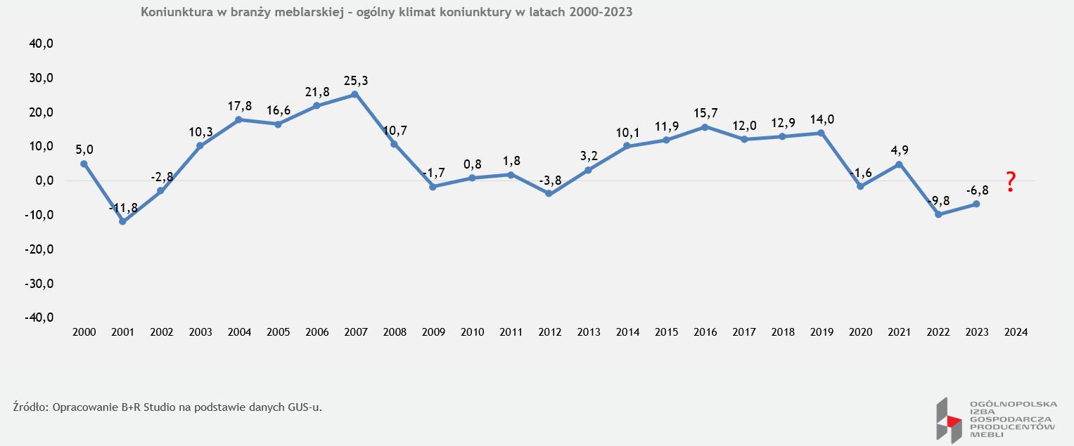 Polska branża meblarska znalazła się w trudnym okresie cyklu gospodarczego. Według opracowania B+R Studio, bazującego na danych GUS, klimat koniunktury w branży meblarskiej w ostatnich dwóch latach był najgorszy od dwóch dekad. Niższy wskaźnik niż w 2023 r. (-6,8) i 2022 r. (-9,8), odnotowano jedynie w 2001 r. (-11,8). Na sytuacji sektora odbiły się przede wszystkim: wysokie koszty prądu i benzyny, szybko rosnące wynagrodzenia, wysoka inflacja i niepewność związana z wojną na Ukrainie.
