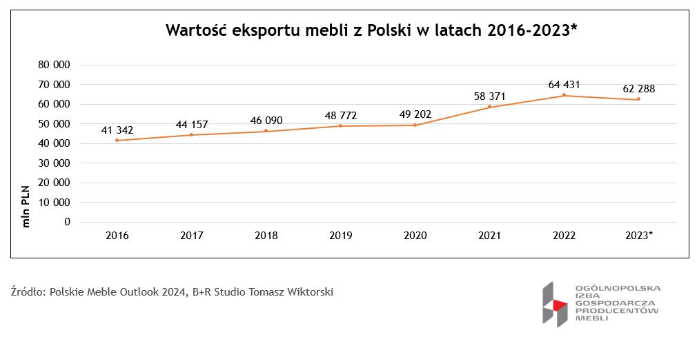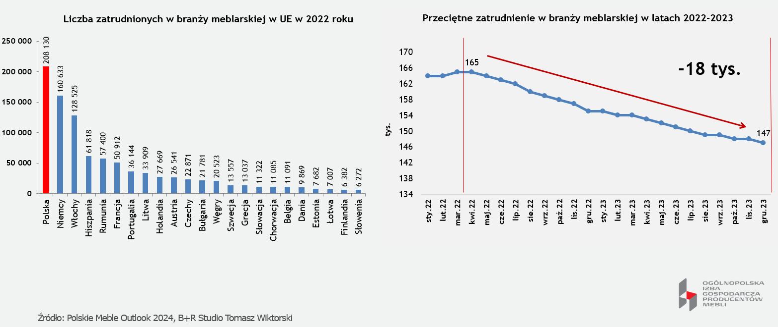Wartość produkcji sprzedanej polskich firm meblarskich w 2023 roku wyniosła 64 mld zł, co oznacza spadek o 6% w stosunku do roku 2022. Mniejsze ilości zamówień oraz rosnące koszty produkcji zaczęły zagrażać rentowności przedsiębiorstw. Aby ratować zakłady oraz dostosować się do zmniejszonej ilości zamówień, firmy meblarskie zostały zmuszone do redukcji zatrudnienia. Od kwietnia 2022 do grudnia 2023 w branży meblarskiej zniknęło 18 tysięcy etatów.