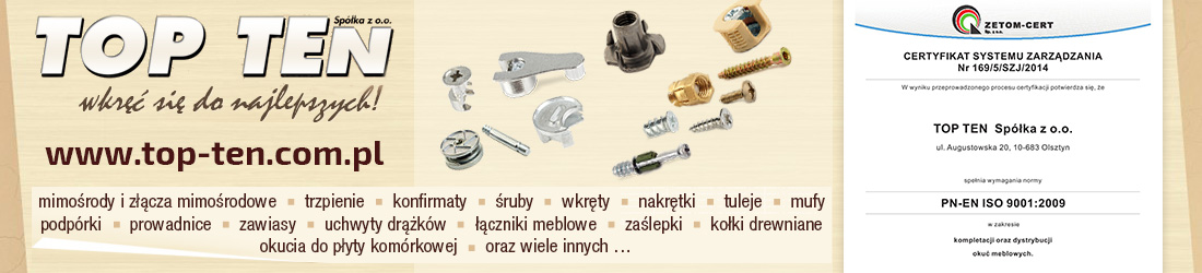 Firma Top Ten specjalizuje się w hurtowej sprzedaży okuć meblowych oraz ich konfekcjonowaniem.