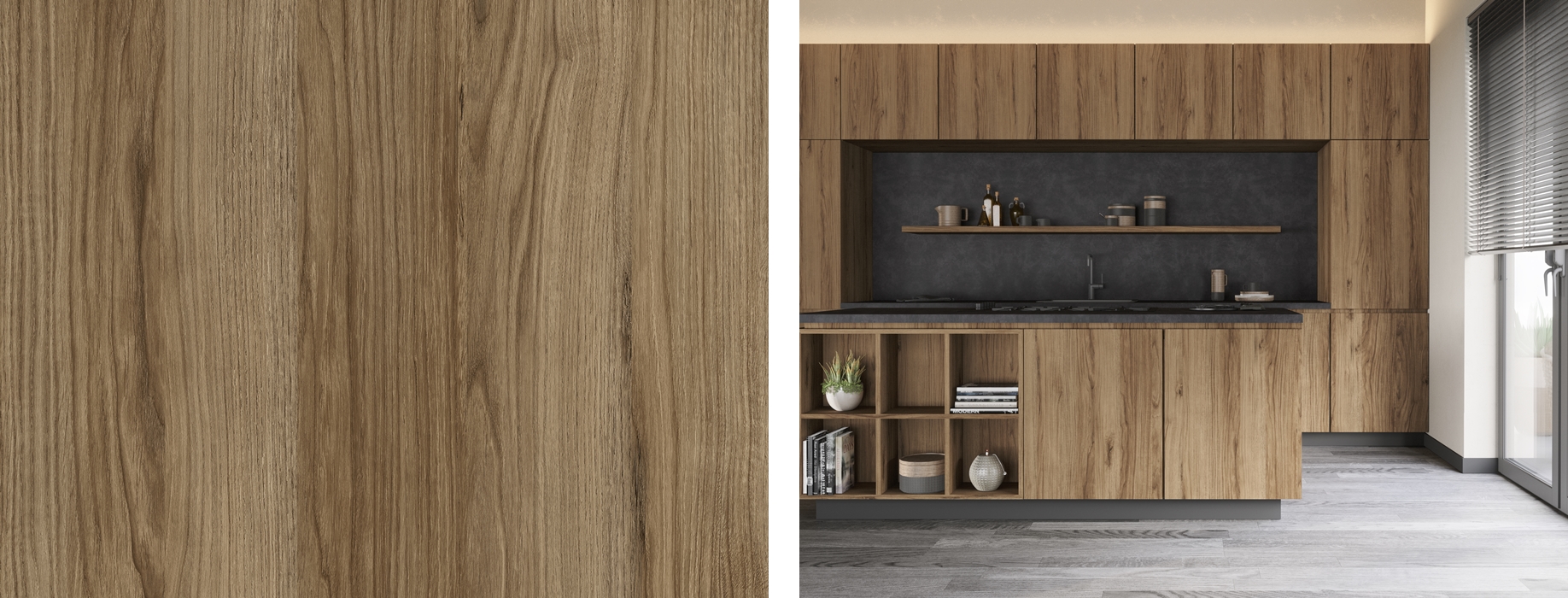 We wnętrza w stylu skandynawskim lub japandi idealnie wkomponuje się Amberwood. Dekor ten użyty na dużych powierzchniach nie przytłacza, dlatego sprawdzi się zarówno na frontach dużych szaf, jak i na innych zabudowach meblowych. Szeroka gama odcieni szarości i beży tworzy harmonijną i niepowtarzalną powierzchnię. Amberwood to hołd złożony unikalnemu materiałowi, który przez kilkaset lat znajdował się pod wodą stanowiąc pale fundamentowe, na których posadowiona była Wyspa Spichrzów w Gdańsku. Czas i specyficzne warunki spowodowały w drewnie nieodwracalne zmiany - gęste usłojenie drewna nabrało niepowtarzalnej wręcz barwy.