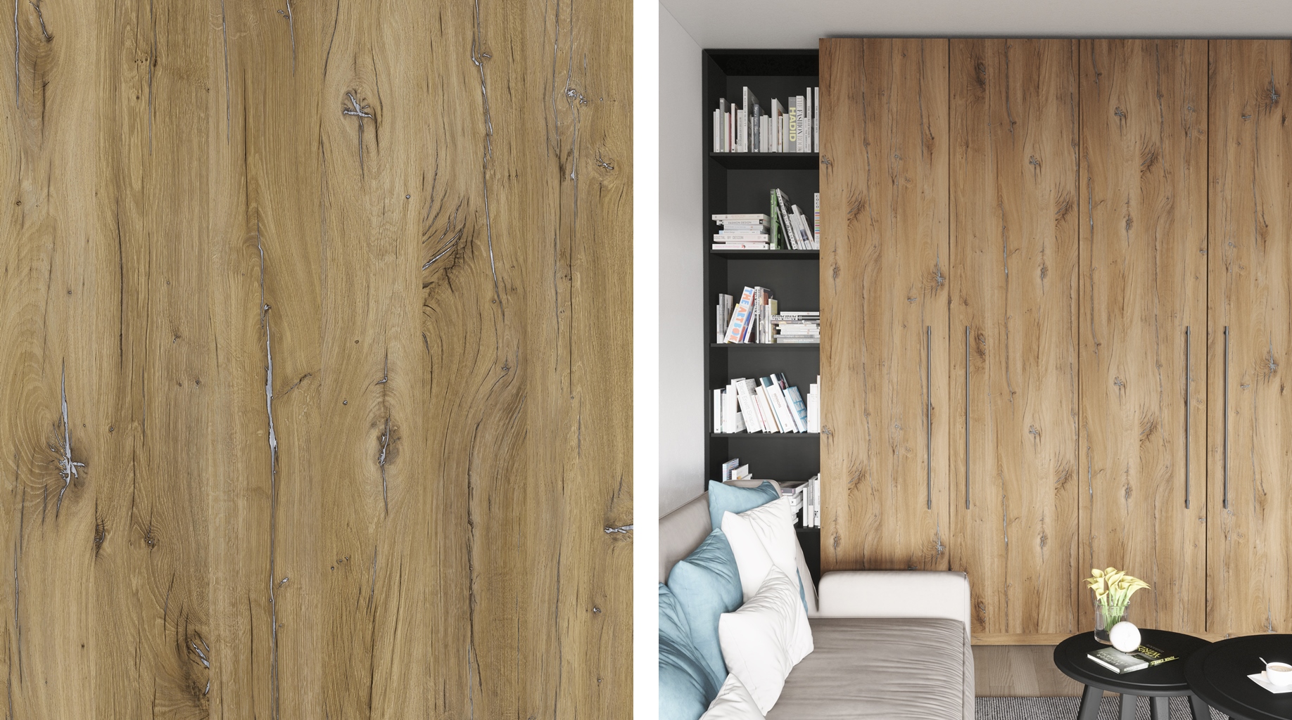 W ten trend doskonale wpisuje się wzór z kolekcji Schattdecor Flagstaff Oak, który wyróżnia się optyką starego, zużytego drewna. Dekor ten zapada nam w pamięć dzięki charakterystycznym pęknięciom wypełnionym metaliczną farbą w kolorze cyny lub złota, które nadają mu ekskluzywnego wyrazu. Wzór ten spotkał się już z dużym uznaniem rynku i otrzymał w 2021 roku nagrodę Interzum Award.