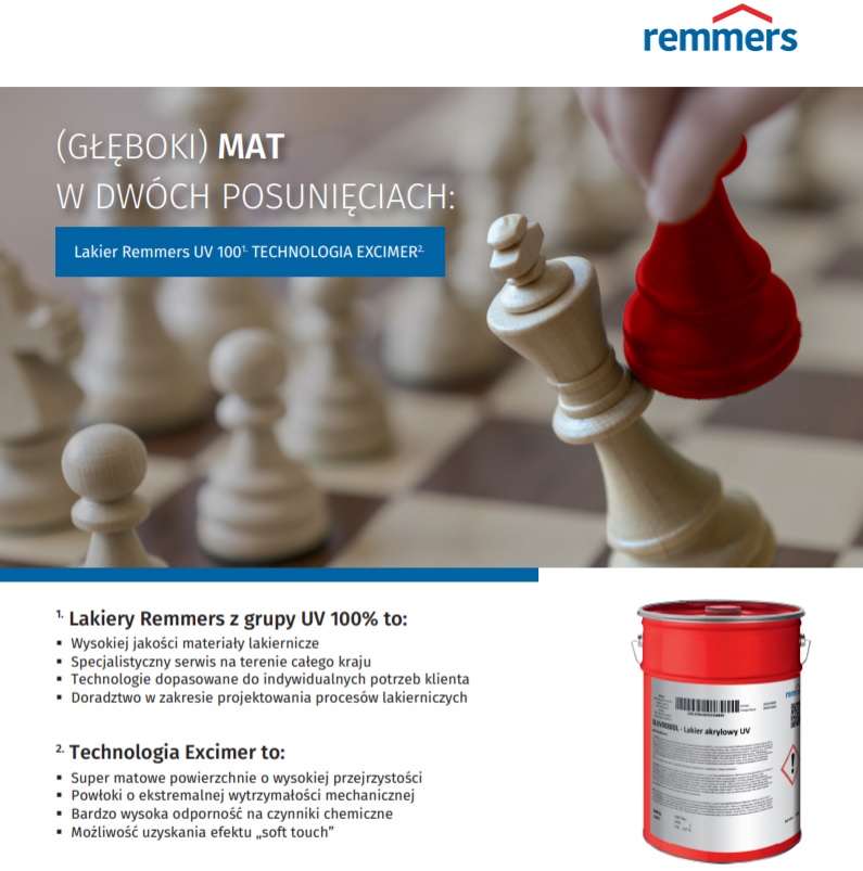 Firma Remmers od kilku już lat śledzi rozwój tej ekscytującej technologii i ma w swojej ofercie szereg lakierów z grupy „UV 100”, doskonale nadających się do stosowania w tej technologii. Lakier Remmers UV 100 i Excimer: dwa posunięcia, i (głęboki) mat pewny.
