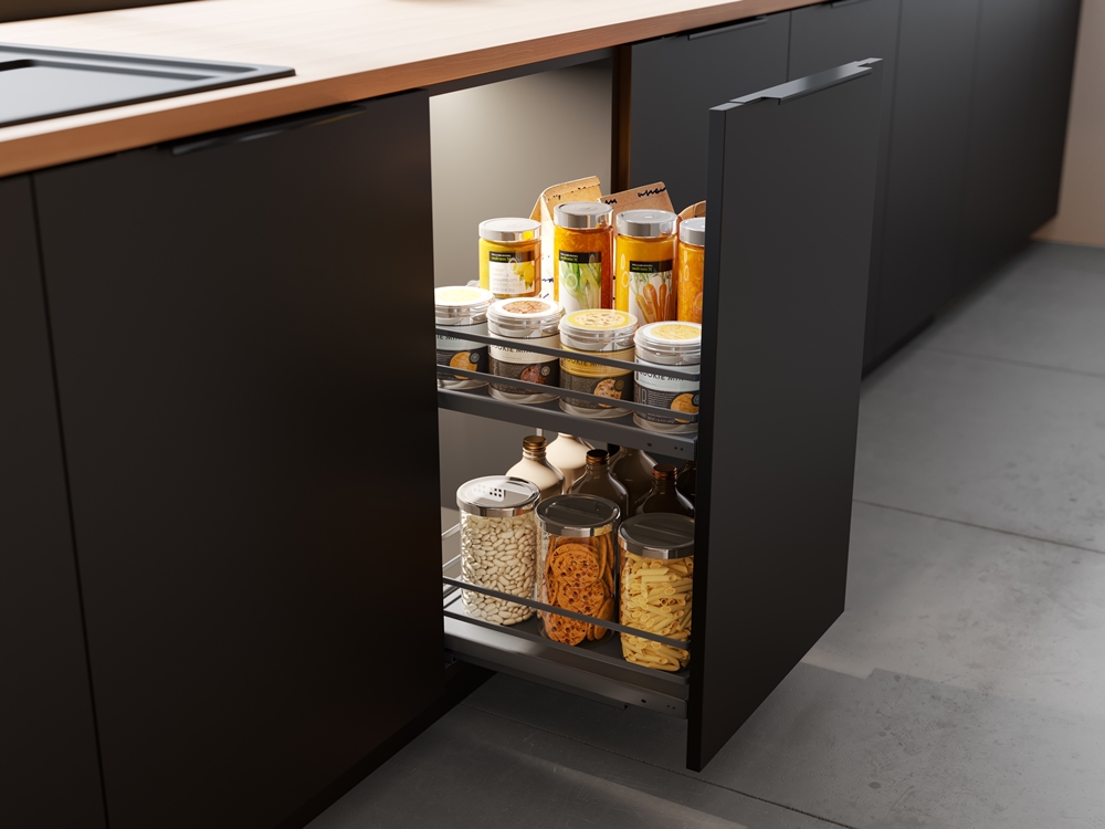 W skład serii MOVIX PRO wchodzą także kosze typu magic corner do przechowywania większej ilości produktów i akcesoriów. Do wyboru mamy wariant wysuwany i uchylny. Kosz wysuwany daje nam możliwość montażu na dwa sposoby: z mocowaniem do frontu lub bez. Cornery umożliwiają nam maksymalne zoptymalizowanie trudnodostępnym miejsc.