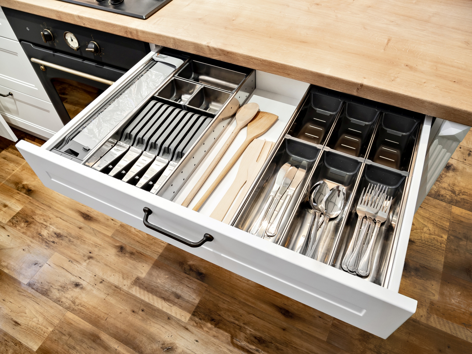 Niemniej kłopotu sprawiają nam liczne drobiazgi, które gromadzimy w kuchni. Niełatwo utrzymać wśród nich porządek i cokolwiek znaleźć, gdy włożymy je do szafek lub głębokich szuflad. Rozsądniej będzie przechowywać je w płytkiej szufladzie w szeregu dolnej zabudowy meblowej. Jest ona idealnym miejscem nie tylko dla sztućców, ale również przydatnych drobiazgów, jak otwieracz do puszek, wyciskacz do czosnku, nożyczki, chochla, różnego rodzaju łopatki i trzepaczki. Kiedy w przejrzyście zorganizowanej szufladzie, w wyznaczonym do tego miejscu będzie folia aluminiowa czy papier śniadaniowy, z pewnością oszczędzimy sobie wiele niepotrzebnego stresu podczas porannego pakowania kanapek do szkoły i pracy.