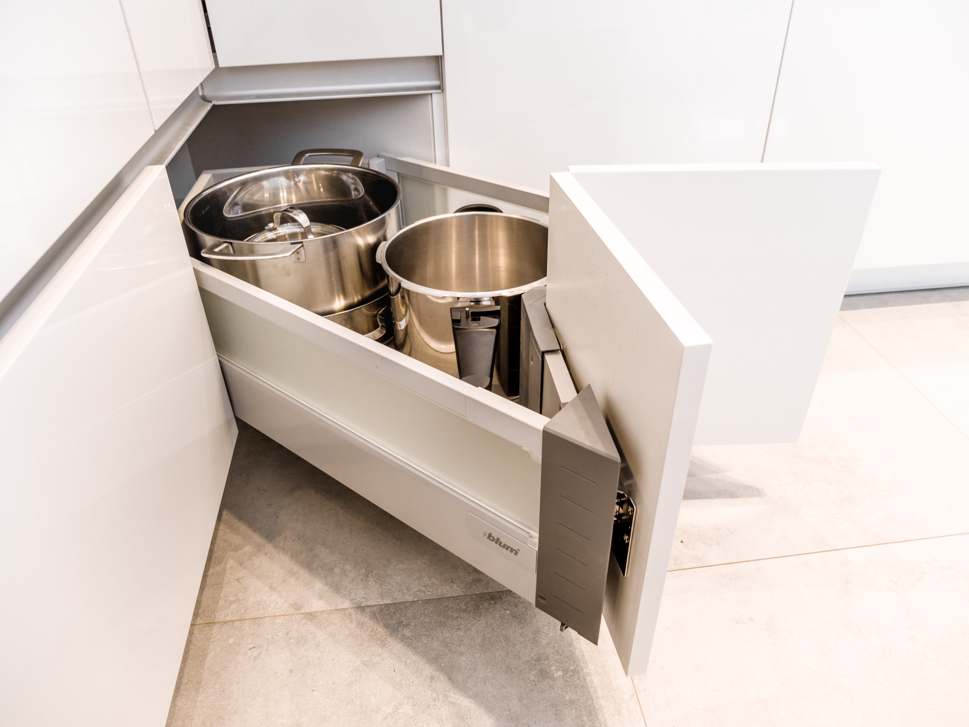 Funkcjonalnym i komfortowym rozwiązaniem są również głębokie, pakowne szuflady narożne. Po ich wysunięciu garnki, rondle i patelnie mamy w zasięgu wzroku i z wygodnym dostępem. Dobierając system szuflad musimy tylko uwzględnić wymiary i wagę dużych naczyń.